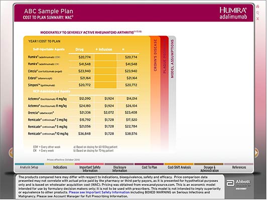 This account manager software helped to demonstrate the appropriate role of Humira on formulary. With established competition and several new market entrants, gaining a clear picture of the category costs was a challenge for health plans. Some agents are self-injected and while others are HCP-administered. Each has its own set of indications, dosing regimens, and costs, which may differ by indication and by patient. The software helped present a clearer picture of overall costs to the plan and helped to demonstrate the value of Humira.